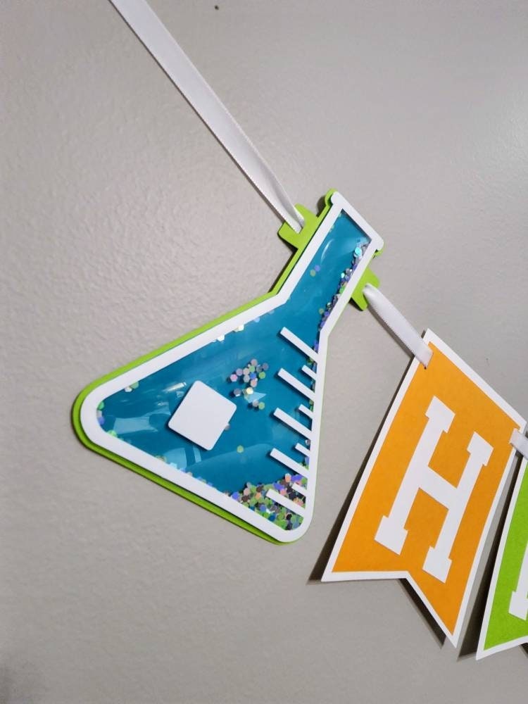 This gorgeous Teal, Green and Orange Science Birthday Banner is created layered cardstock and pre-strung with white ribbon, making it ready to hang to celebrate your little scientist!