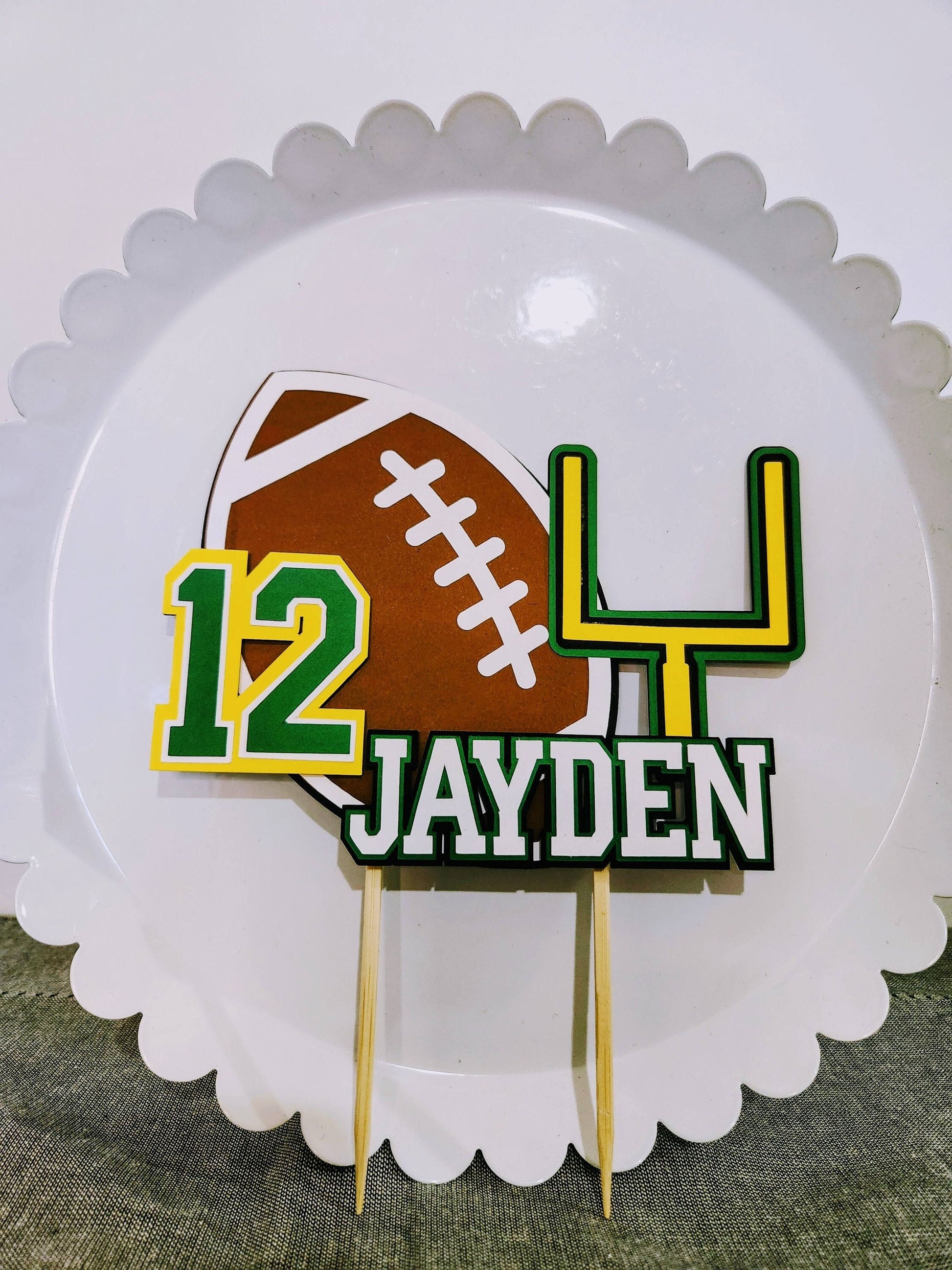 This beautiful handmade, customizable football birthday party cake topper will be a stunning addition to your cake and will make a beautiful keepsake. This cake topper is about 7 x 6 inches and custom sizes are available.