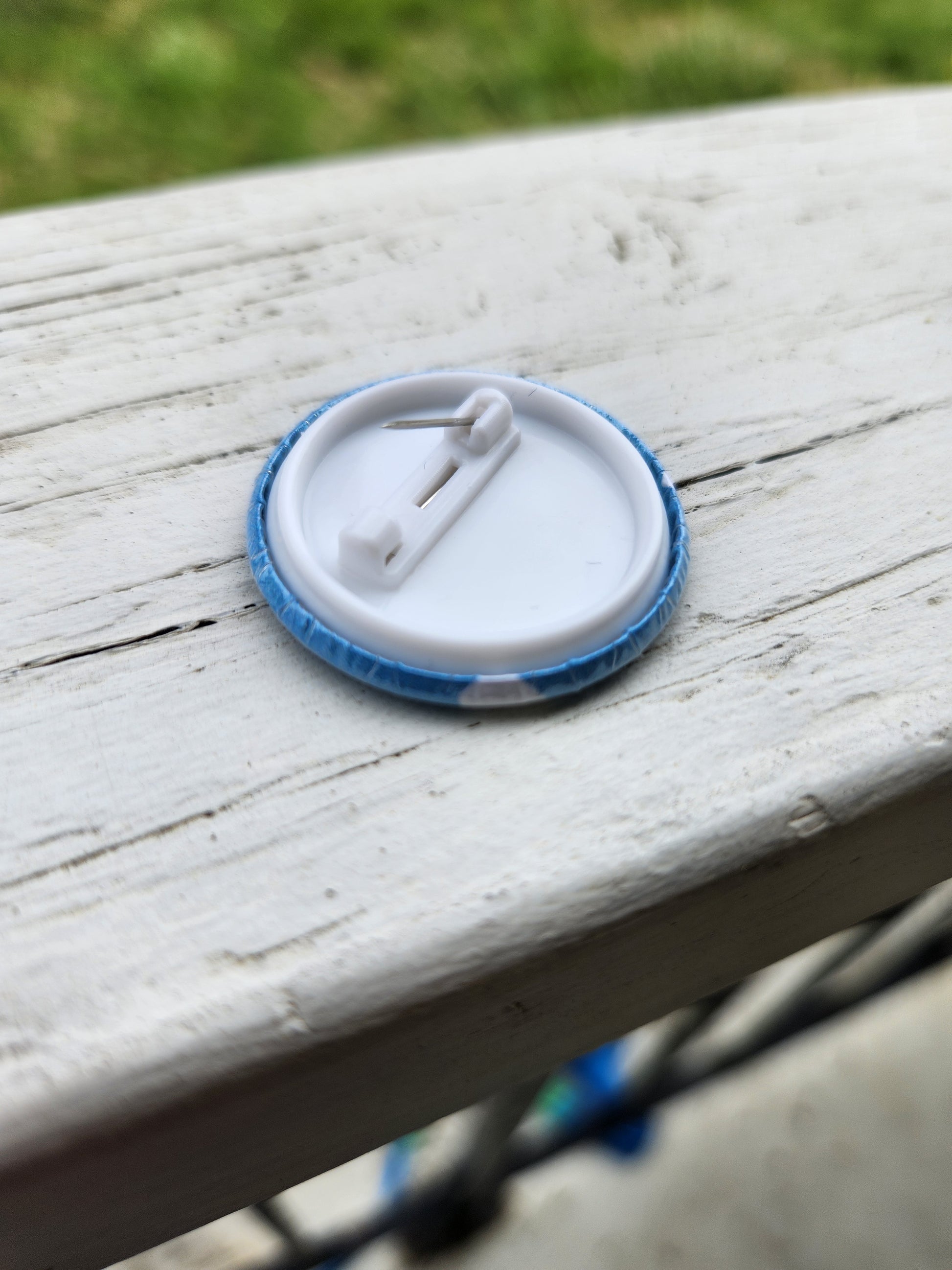 The sturdy pin back is secure enough to place on a lanyard, shirt, jacket, hat or bag.