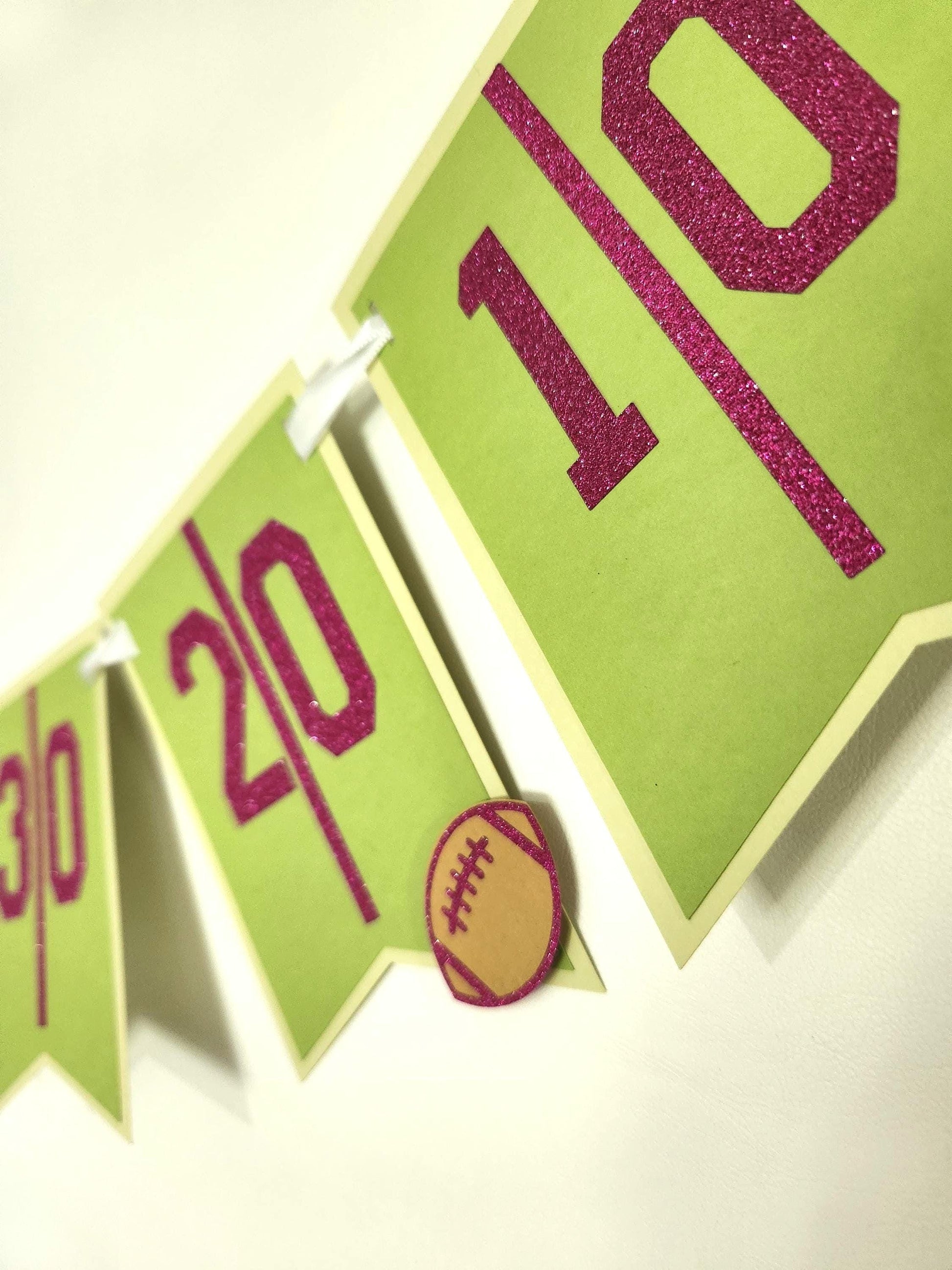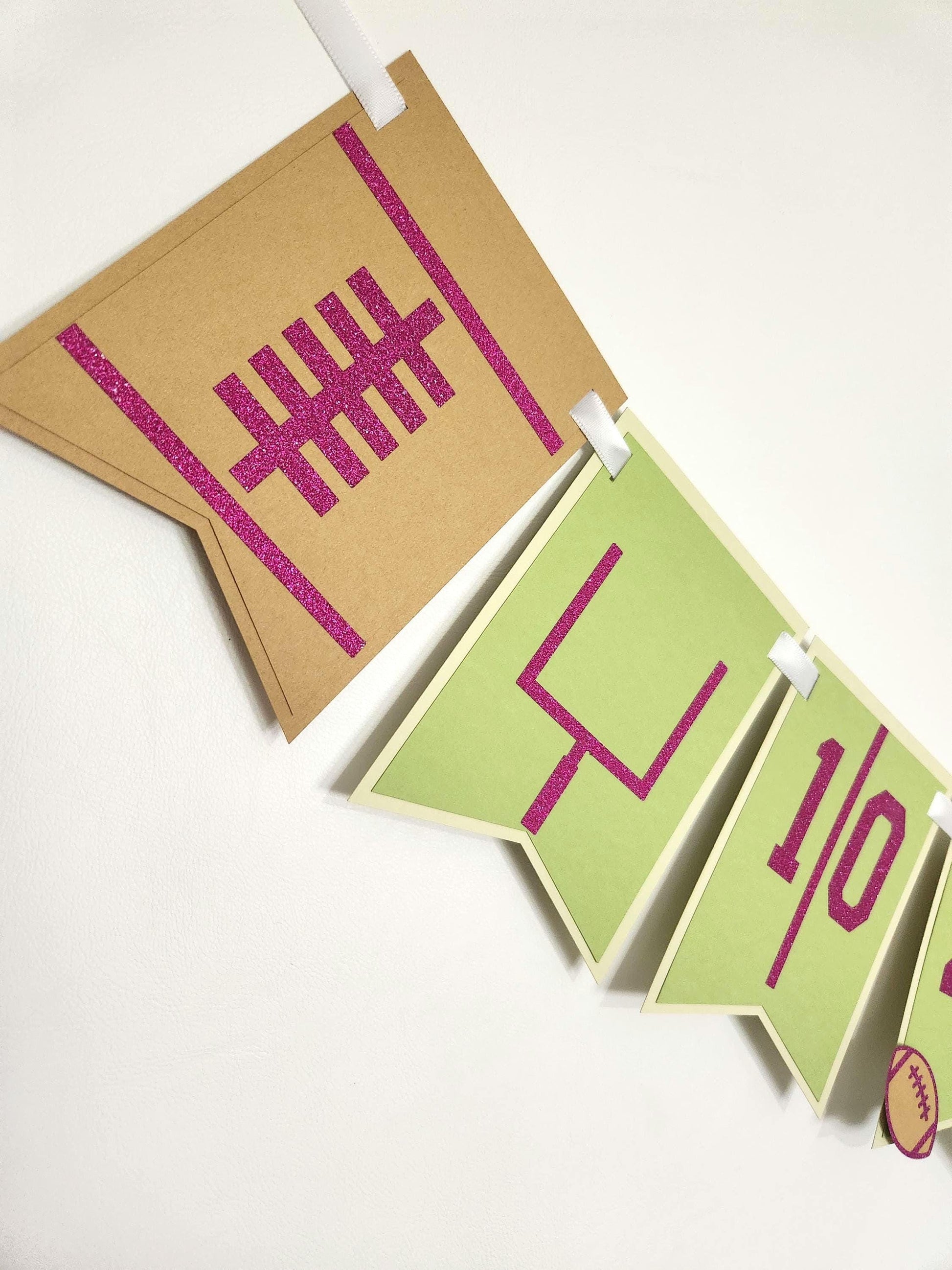 Created with layered cardstock and eye-catching pink glitter vinyl, this is a stand-out lovingly handmade banner for any football celebration you plan. This banner would make a perfect backdrop for a football birthday party, first down birthday celebration or even a football tailgate party.