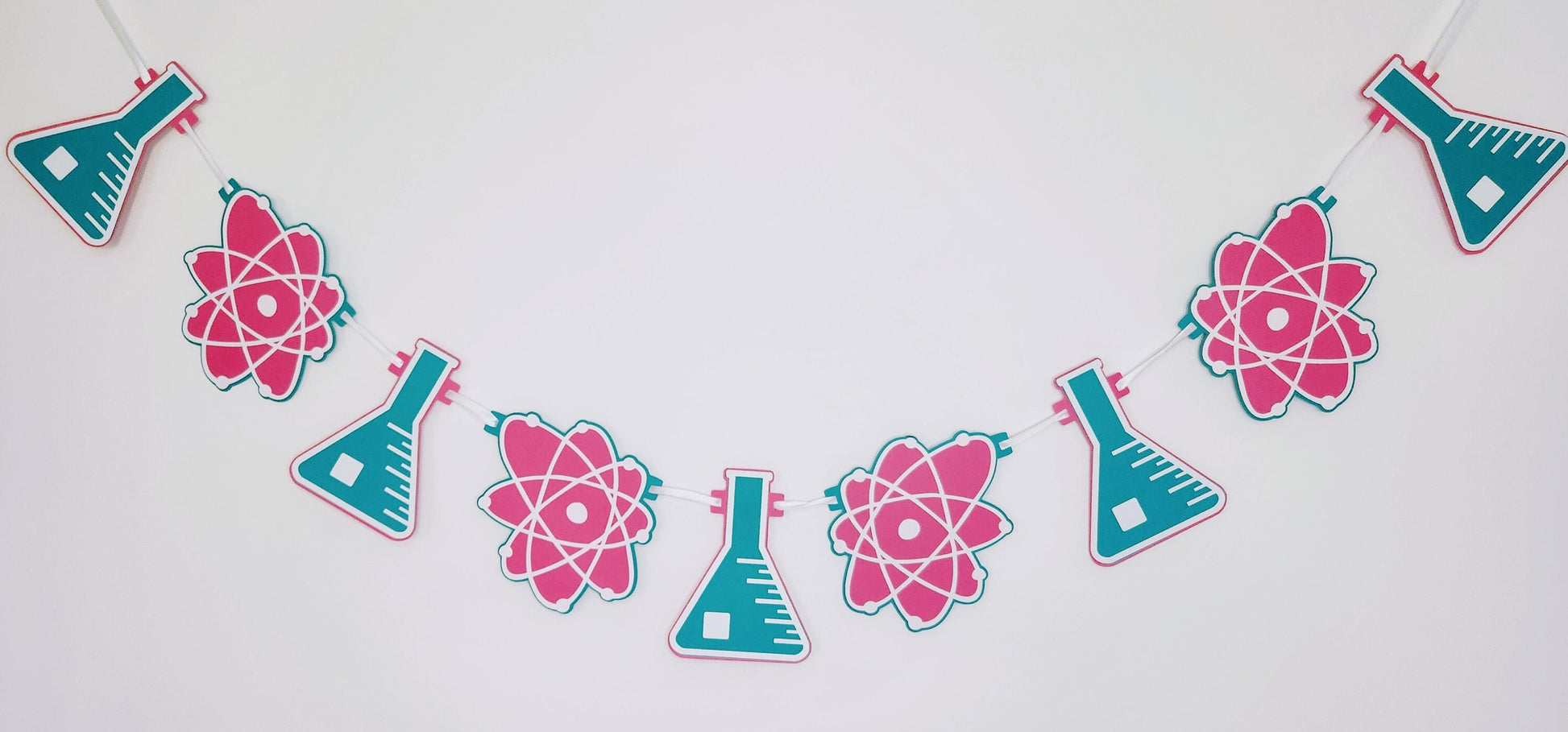 This gorgeous handmade Science Birthday Garland is created layered cardstock and vinyl and comes pre-strung with white ribbon, making it ready to hang to celebrate your little scientist!